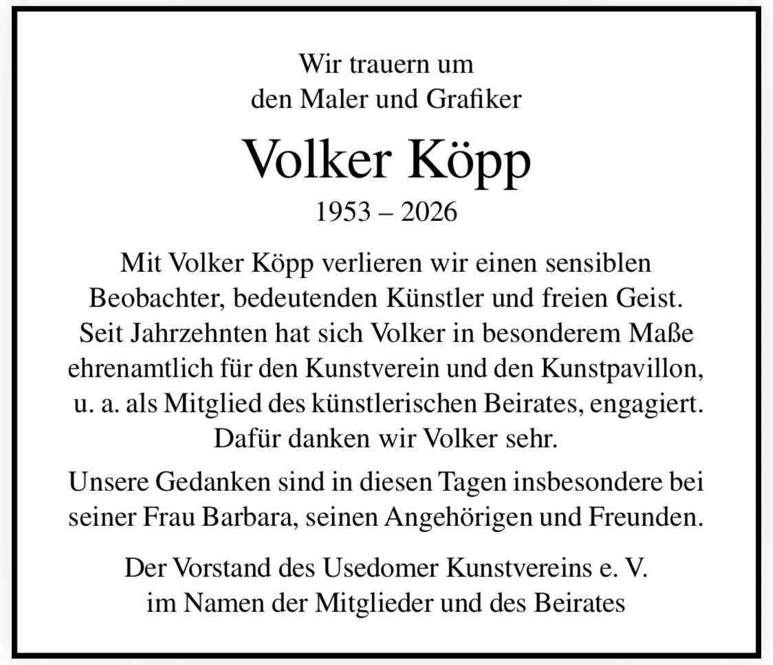 Volker Köpp ist in der vergangenen Woche gestorben. Mit ihm verliert die Insel Usedom eine unverwechselbare Stimme von überregionaler künstlerischer Bedeutung, die über Jahrzehnte hinweg das kulturelle Leben der Insel bereichert hat. 1953 in der Stadt Usedom geboren, wuchs Köpp in Ahlbeck auf. Sein Werk sollte davon nachhaltig beeinflusst sein. Volker Köpp hat auf Usedom ein völlig eigenständiges Werk geschaffen, das durch seine Herkunft, aber auch durch sein Studium an der Hochschule für Bildende Künste in Dresden geprägt wurde. Oft erzählte Volker Köpp, wie sehr er seinen Lehrer Siegfried Klotz schätze, wie sehr er auch durch ihn geprägt wurde.